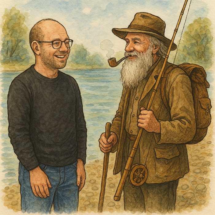 Miközben próbálkozott, a dzsindzásból előbukkant egy hosszú szakállú, kalapos, pipás ember, akinek egyik kezében egy vándorbot, a másik kezében pedig egy nádbot és egy merítőháló volt. A táskája is valami régi darab volt, teletűzdelve mindenféle horgász kitűzővel, úszókkal, tollakkal. Igazi jelenség volt. Gyula azt hitte, hogy a szeme káprázik. Ráadásul nem is úgy jött oda, hogy „vót valami,” hanem kalapját megemelve illedelmesen köszönt a napszaknak megfelelően, majd bemutatkozott
